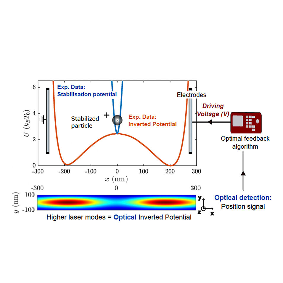 Our configuration results in optical frequencies of -50 kHz at the unstable potential maximum at the center of the double well, and 65 kHz at the stable trapping positions of the two wells, located at a distance of approximately +/- 200 nm from the beam axis. Negative resonance frequencies correspond to the negative stiffness of the inverted potential. Optical readout of the particle motion is obtained via a standard detection scheme based on interference between the TEM00 mode and the light scattered by the particle. The TEM00 beam is actively stabilized using piezo-controlled mirrors to prevent drifts in position detection. The detection signal is processed via an FPGA and used to apply feedback control to the charged silica nanosphere electronically, via a pair of electrodes mounted along the double-well axis. The experiment is performed with 210 nm diameter silica particles at a pressure of 1.5 mbar. By using a Kalman-filter-based linear-quadratic-Gaussian (LQG) control method, we confine a particle to within 9 +/- 05 nm of the potential maximum at an effective temperature of 16 K in a room-temperature environment. Despite drifts in the absolute position of the potential maximum, we can keep the nanoparticle at the apex by estimating and autonomously compensating the drift from the particle dynamics using the Kalman filter.